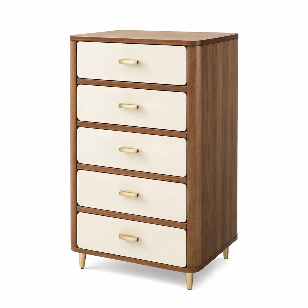 Realizzata principalmente in MDF con rivestimento in impiallacciatura di noce, questa cassettiera è dotata di 5 cassetti spaziosi. Le maniglie in metallo dorato aggiungono un tocco distintivo. Misura 120 cm di altezza, 60 cm di larghezza e 45 cm di profondità, con un peso netto di 35 kg.
