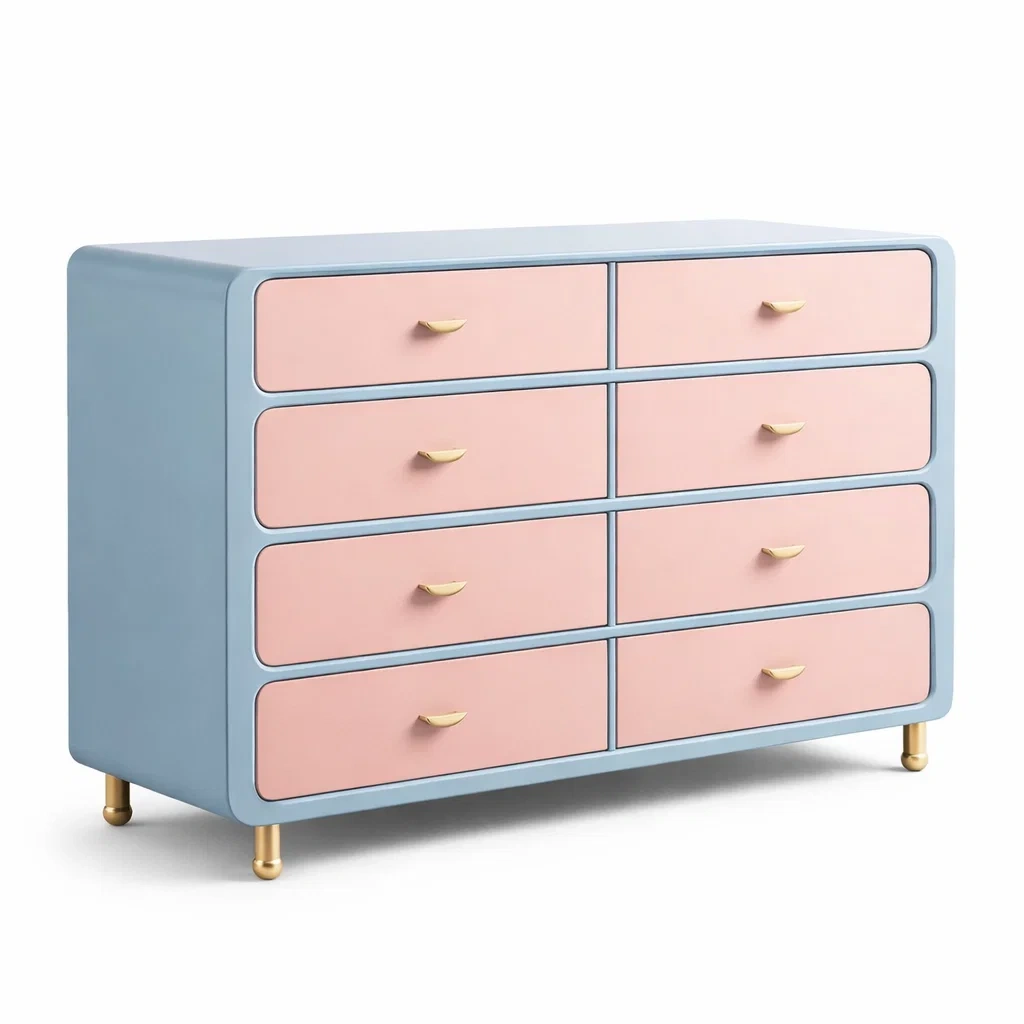 Questa cassettiera presenta una struttura in MDF con gambe in acciaio dorato. Include 8 cassetti spaziosi per organizzare i tuoi oggetti personali. Misure della cassettiera: 120 cm di lunghezza, 45 cm di larghezza e 85 cm di altezza. Colore principale Blu e Rosa. Supporta un peso complessivo di 25 kg.