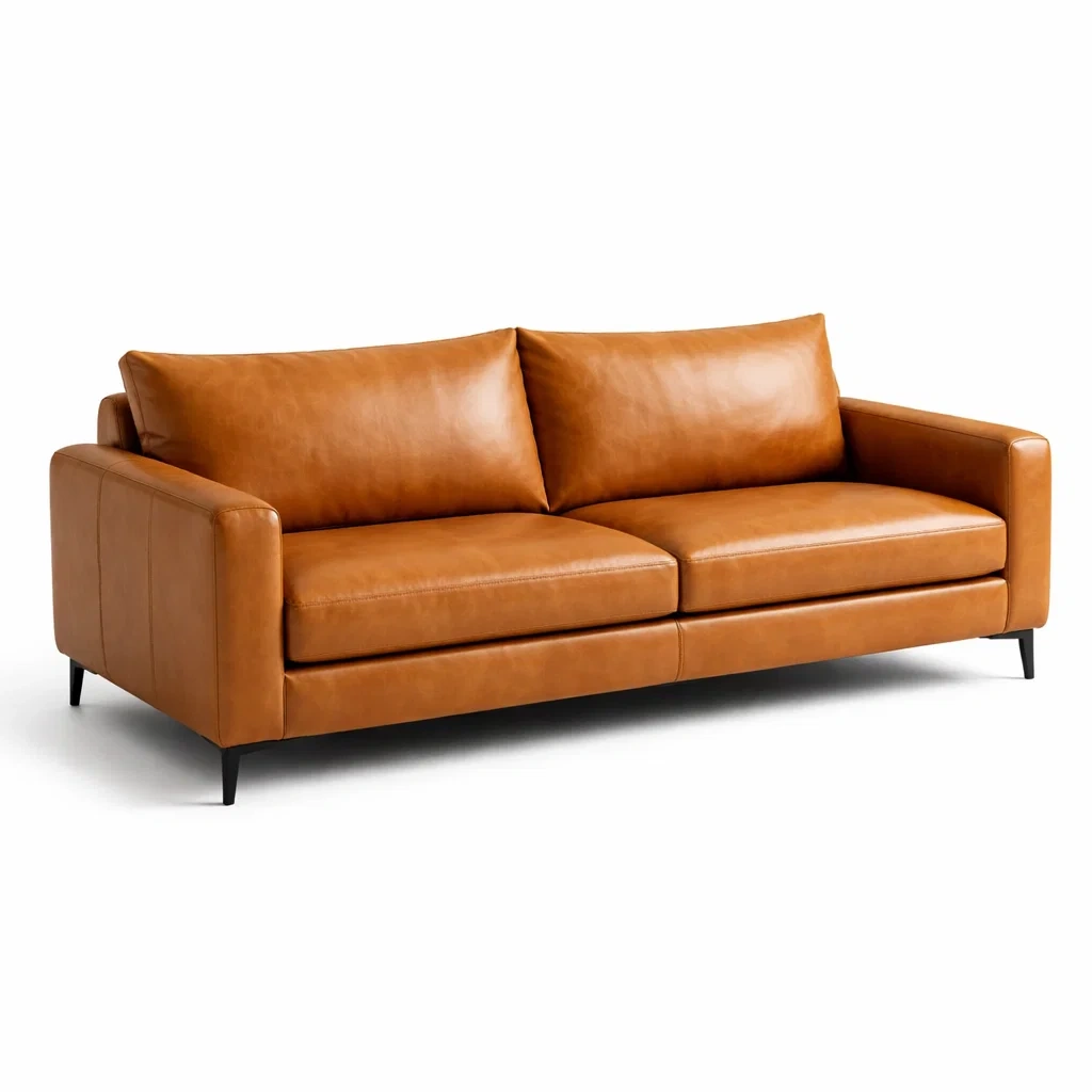 Questo divano presenta un rivestimento in pelle bovina, con una struttura interna in legno massello. I cuscini della seduta sono imbottiti con schiuma ad alta densità e il rivestimento dello schienale è removibile. I piedi sono realizzati in metallo verniciato nero. Dimensioni: 200 cm di lunghezza, 90 cm di larghezza, 85 cm di altezza.