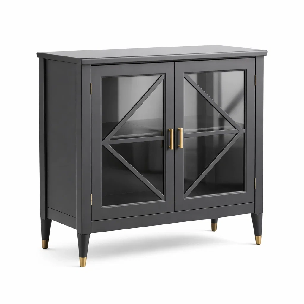 Questa credenza è realizzata in legno MDF con una rifinitura laccata. Le ante sono in vetro temperato e spesse 5 mm. Le dimensioni sono: altezza 90 cm, larghezza 80 cm, profondità 40 cm. Il colore principale è Grigio con dettagli Dorati. È dotata di 2 ante in vetro e 2 ripiani interni. Le maniglie sono in metallo dorato. Il peso totale è di 25 kg.
