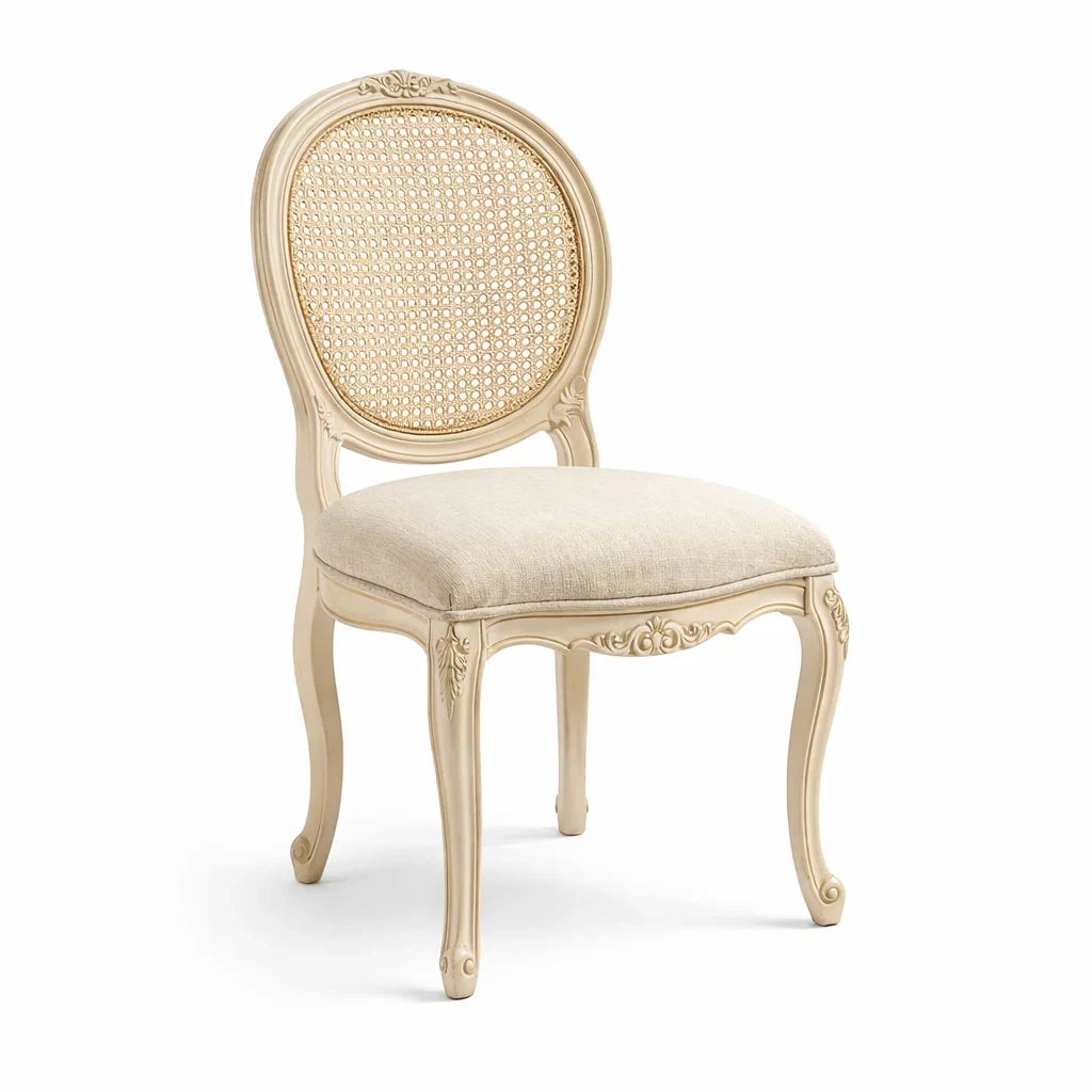 Materiale: Struttura in legno massello, schienale in rattan intrecciato, seduta imbottita in tessuto di lino.