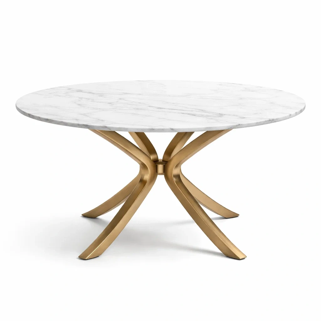 Il tavolo rotondo presenta un piano in marmo bianco con venature grigie e una robusta base in metallo dorato. Il piano marmoreo è rifinito lucidamente per resistere ai graffi. Le dimensioni del tavolo sono 120 cm di diametro e 75 cm di altezza. Peso totale 45 kg.